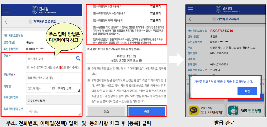 P로 시작하는 13자리 번호로 1회 발급 후 계속 사용 가능하며, 조회는 [모바일관세청] 앱 또는 발급 웹사이트에서 본인 인증 후 즉시 확인할 수 있습니다.