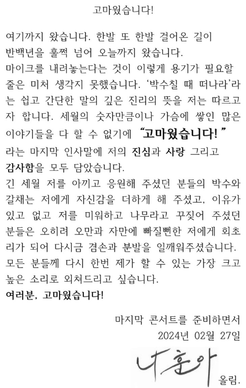 2. 나훈아의 은퇴를 알리는 편지 내용