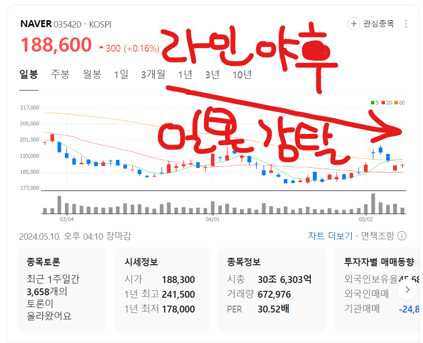 10일 유가증권시장에서 네이버 주가는 0.16% 오른 18만8600원에 거래를 마감했다. 일본 정부가 라인야후 주식 매각을 압박한 영향으로, 지난 8일과 9일에는 각각 2%, 1.36%의 하락을 기록한 후, 이날 약간의 상승으로 마무리되었다.
