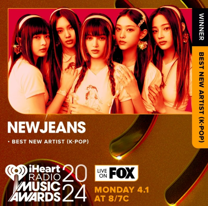 뉴진스는 2024년 1일, 미국 로스앤젤레스에서 열린 '아이하트라디오 뮤직 어워즈'에서 K팝 최고 신인상을 수상했다.