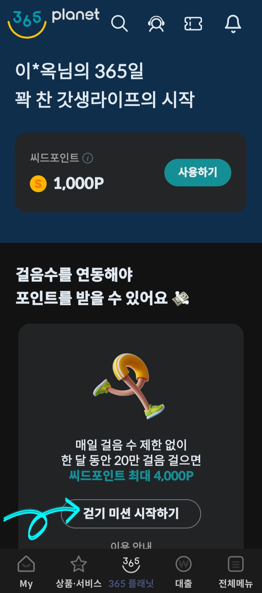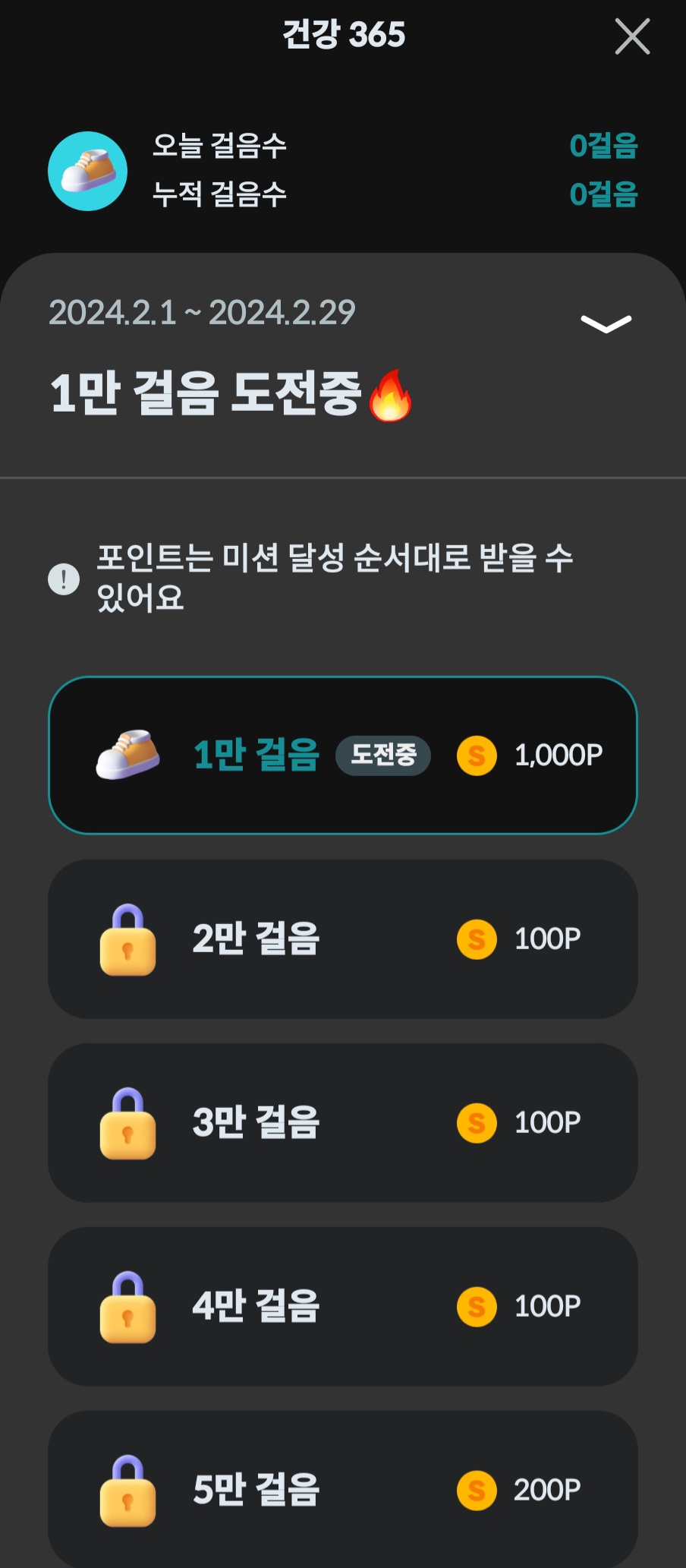 걷기 미션 시작하기를 눌러서 열심히 걸으면 1만 걸음부터 포인트를 적립받을 수 있습니다.