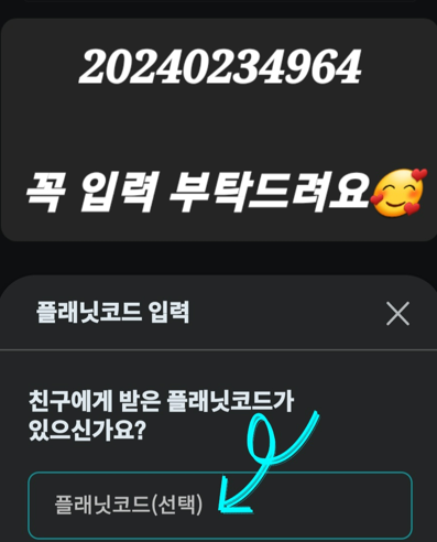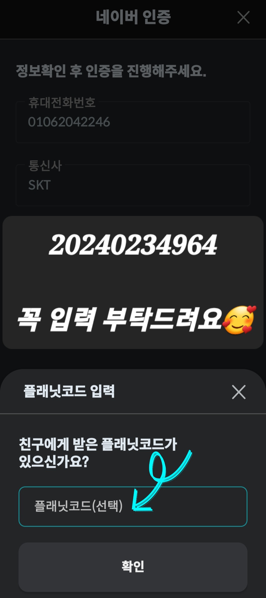 개인정보 인증 후 플래닛코 입력에 반드시 20240234964 를 입력해 주세요.