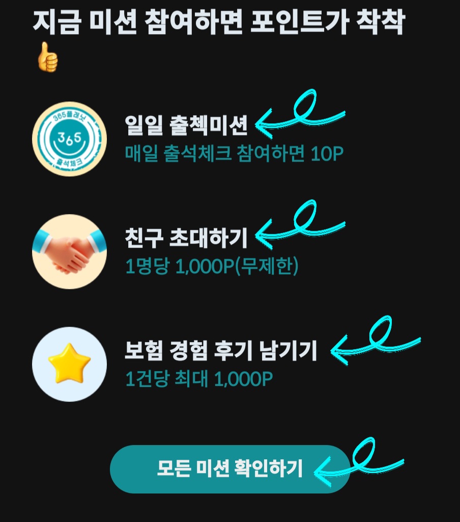 매일 일일출첵미션 누르면 10P 적립됩니다.