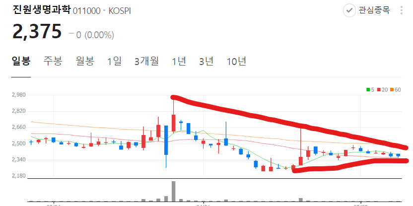 진원생명과학 주가는 2021년 이후 계속 빠지고 있고 일봉을 보면 삼각수렴으로 20일선 위에 있습니다.
