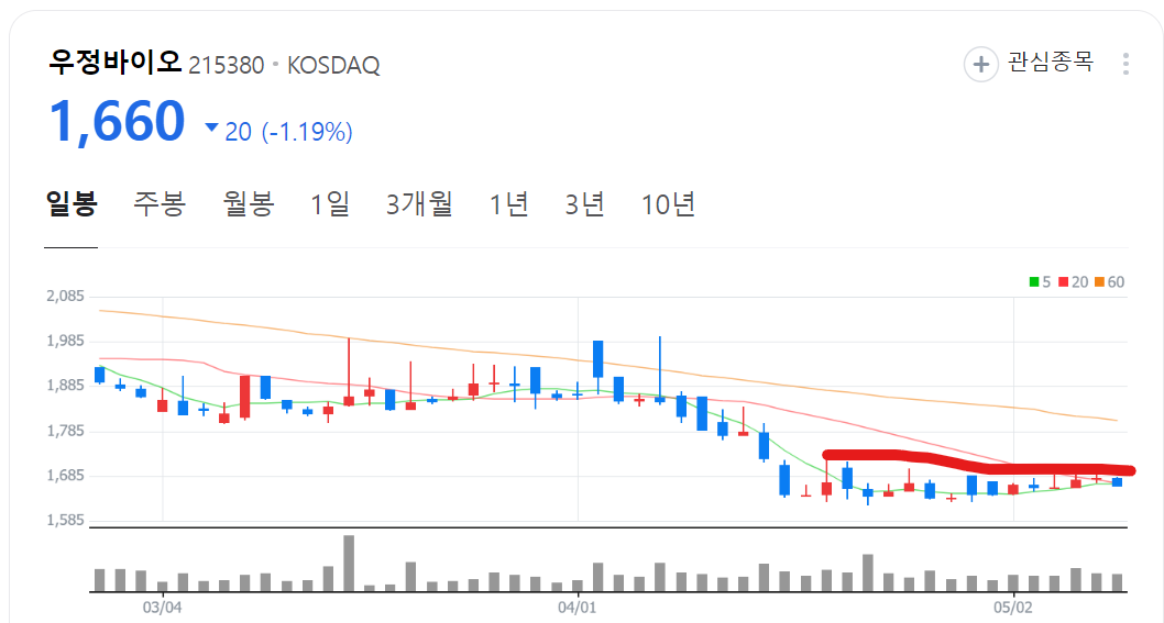 우정바이오도 계속 하락 중 60선 밑에서 횡보 중에 있습니다.