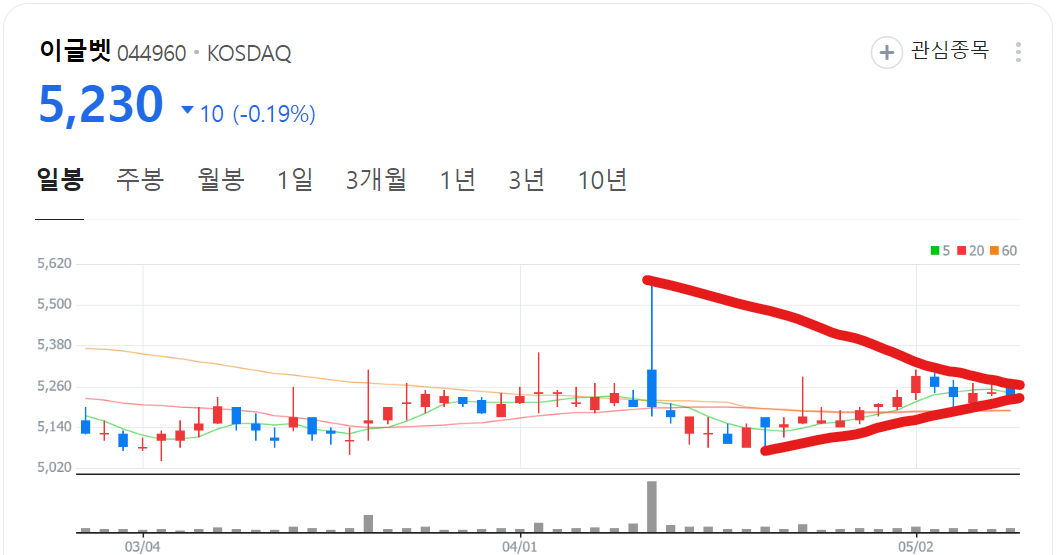 이글벳 주가도 진원생명과학과 비슷한 모양으로 3년간 빠지다가 일봉 삼각수렴중으로 60일 위에서 5일선을 타고 있습니다.