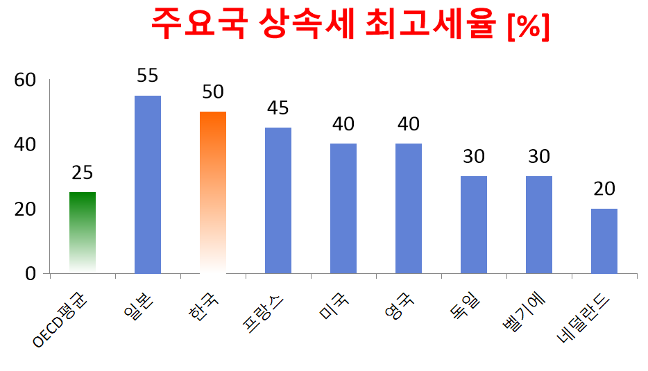 OECD 평균 상속세율은 26% 인데 반하여, 한국은 최고세율 50%로 OECD 1위인 일본 다음인 2위를 차지하고 있다.