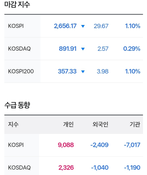 마감지수를 보면 코스피, 코스닥 하락하였습니다.