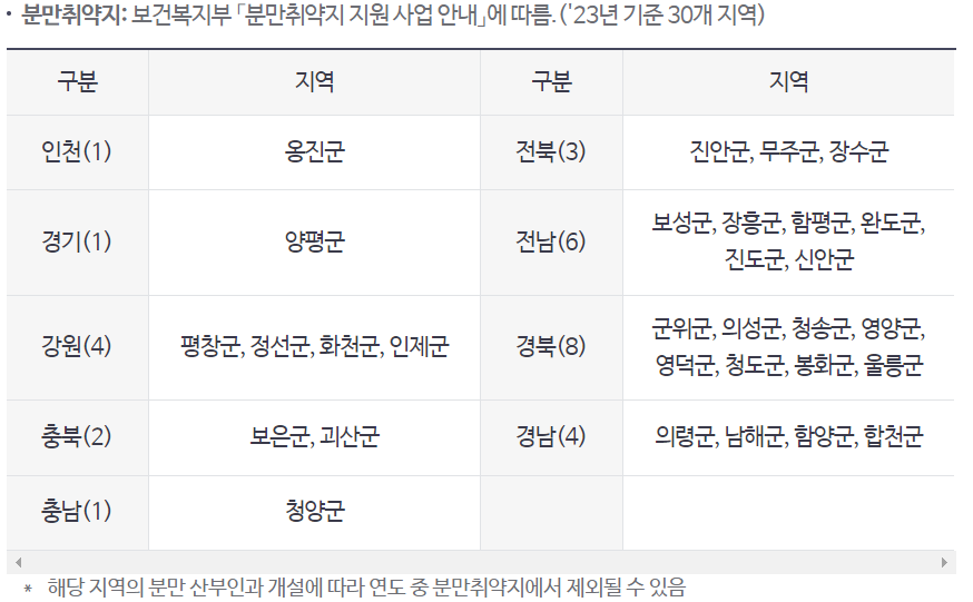 * 분만취약지의 경우20만 원 추가지원(일태아 120만 원, 다태아 160만 원)