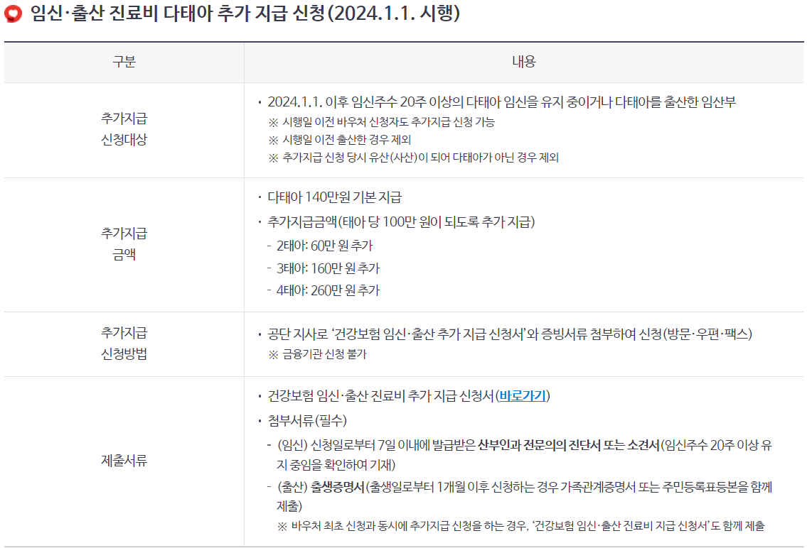 • 다태아 추가지급 신청대상: 2024.1.1. 이후 임신주수 20주 이상의 다태아 임신을 유지 중이거나 다태아를 출산한 임산부