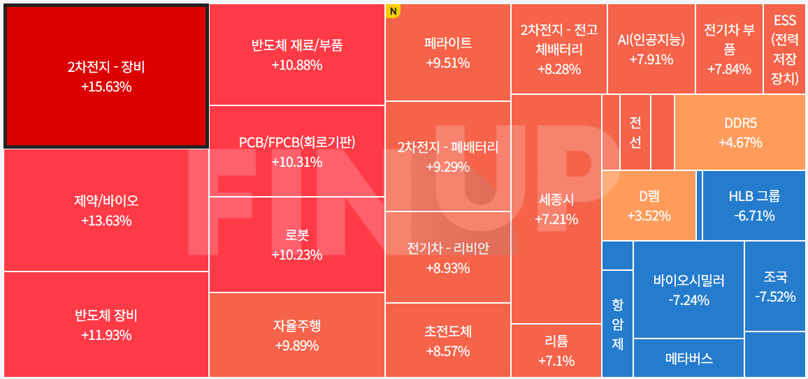 오늘의 시황으로 2차전지/장비, 제약/바이오, 반도체 장비/재료/부품, 로봇, 자율주행 관련주가 상승하였습니다.