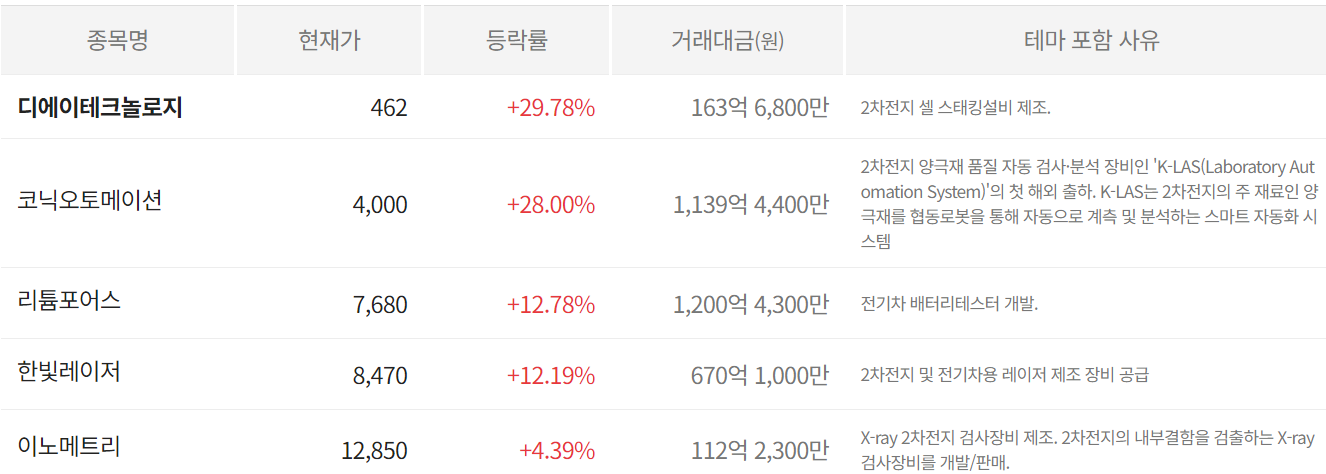 2차전지/장비 상승종목으로 디에이테크놀러지, 코닉오토메이션, 리튬포어스, 한빛레이저, 이노메트리가 상승하였습니다.
