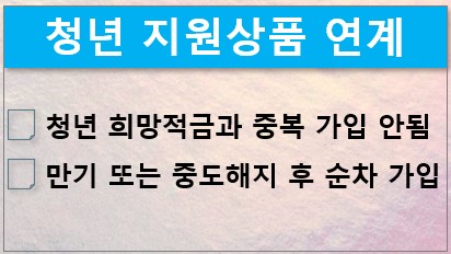 다만, 청년내일저축계좌나 각종 지방자치단체 상품 등 복지상품 및 고용지원 상품과는 동시 가입 허용된다.