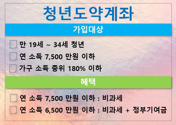 가입대상은 청년(만 19~34세) 중 개인소득 기준(총 급여 6,000만 원 이하는 정부기여금 지금+비과세 적용, 6000~7,500만 원은 비과세만 적용)과 가구소득 기준(가구소득 중위 180% 이하)을 충족하는 경우 가입할 수 있다.