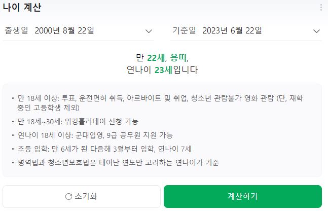 예를 들어, 2000년 8월 22일 출생자는 2023년 6월 22일 기준으로 연나이 23세가 되고, 생일이 지나지 않아서 1년을 빼주면 만 22세가 됩니다.