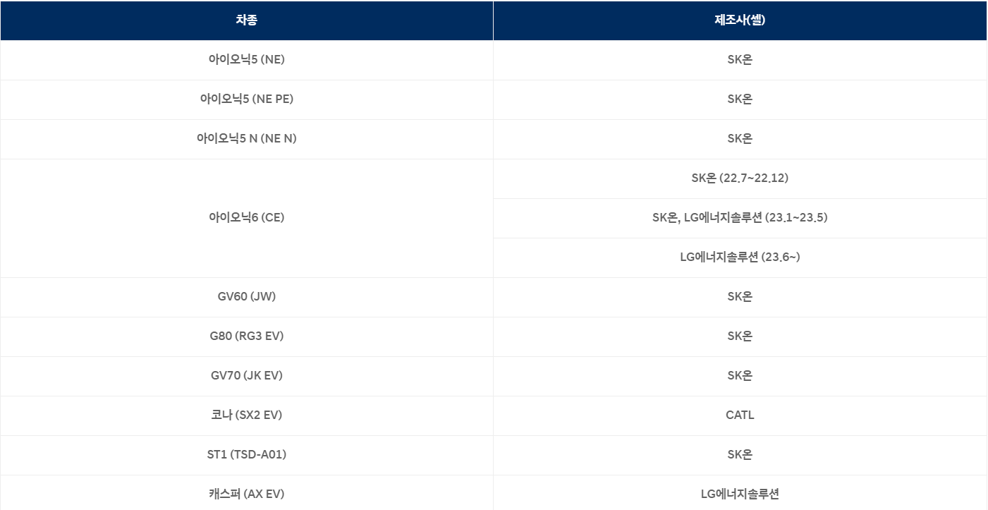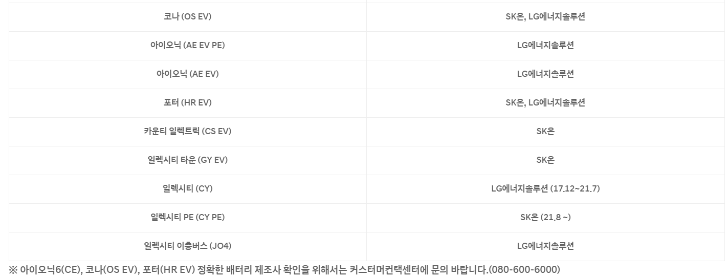 [ 현대자동차 전기차 차종별 배터리 제조사 현황 (출처 : 현대자동차) ]