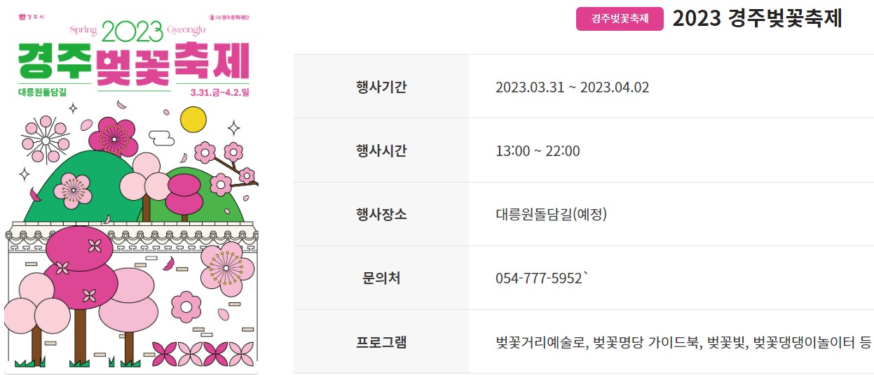 | 2024년 벚꽃 축제, 경주 대릉원돌담길 벚꽃축제 (3월22일~24일) (72) | 2024.03.18 |