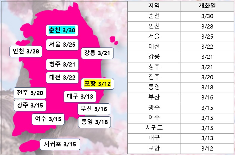 2023년도에는 포항이 3월 12일로 벚꽃이 가장 일찍 개화하고 춘천이 3월 30일로 약 18일 늦게 개화가 예상된다.