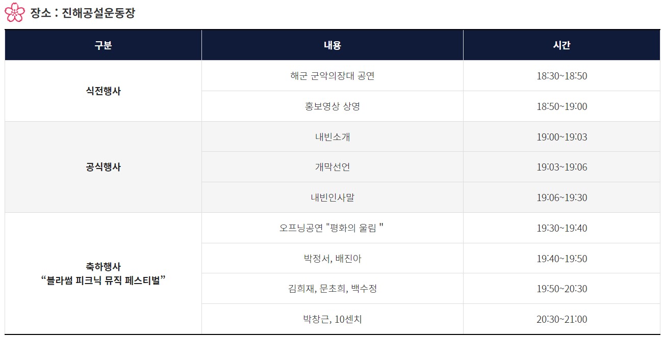 한국의 남동부에 있는 도시 창원시 진해에서 열리는 이 축제는 한국에서 가장 크고 유명한 벚꽃 축제 중 하나이다. 올해는 벚꽃이 만개한 3월 25일(토)부터 4월 3일(월)까지 열릴 예정으로 3월 24일(금) 개막 전야제에 볼거리가 많기 때문에 꼭 방문할 것을 추천한다.