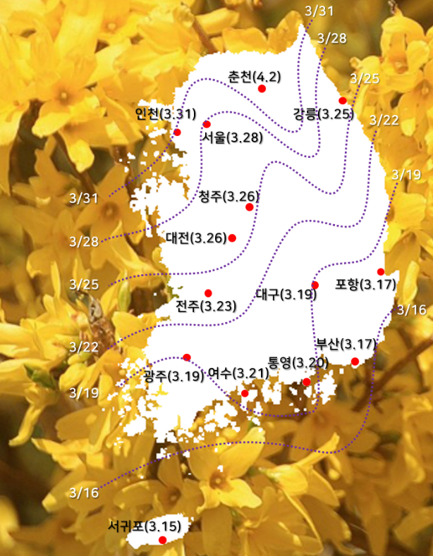 올해 개나리는 서귀포에서 3월 15일, 서울에서 3월 28일 개화가 예상됩니다.