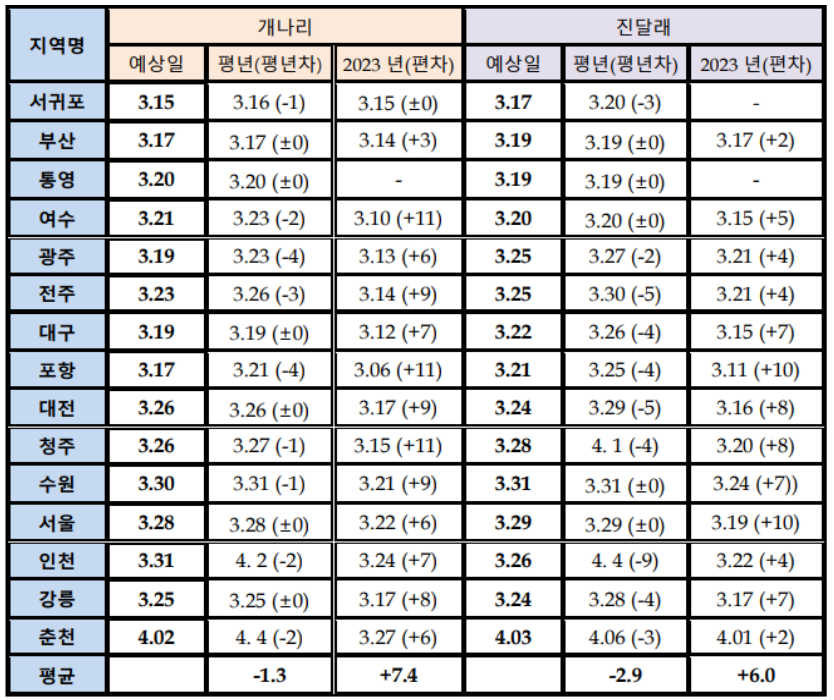 다음은 주요도시 봄꽃 개화시기 입니다.